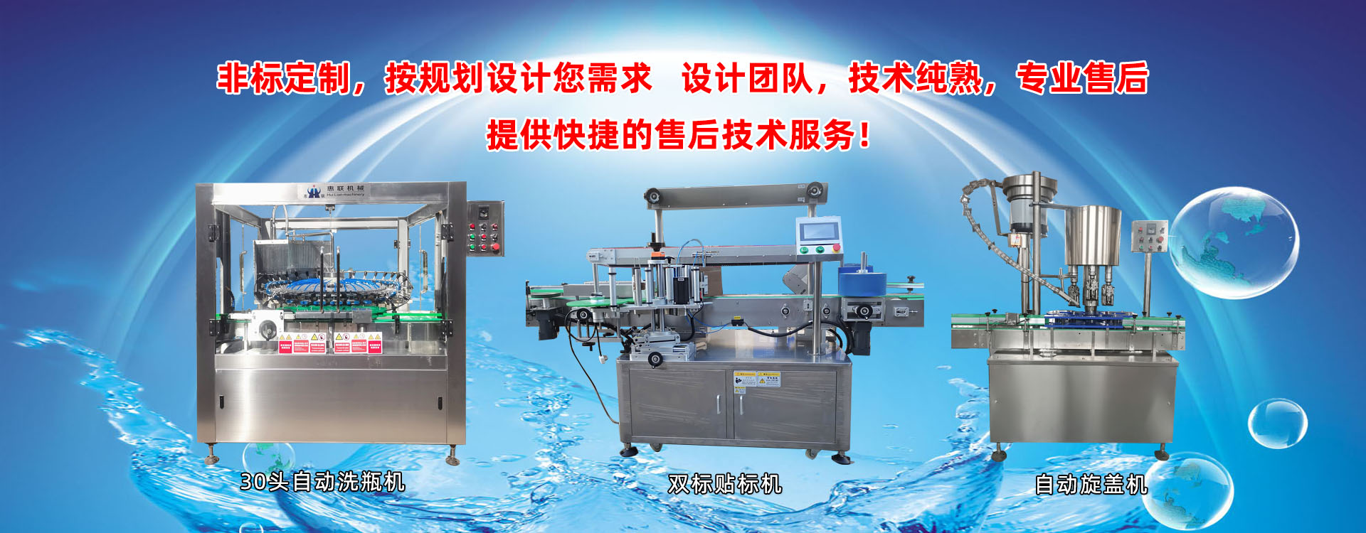 青州市惠聯灌裝機械有限公司是一家集生產研發、銷售、服務于一體的液體灌裝成套設備生產企業,可根據廠家要求設計合理液體灌裝生產線,為用戶提供技術咨詢、設計工藝、場區平面布置、工藝改造、設備安裝調試等完善服務。 公司生產制造各種類型液體灌裝機、過濾機,水處理設備及液體灌裝成套設備。主要產品有:白酒、葡萄酒、黃酒等酒水灌裝機、食用油、機油、潤滑油等油類灌裝機、醬油醋、老抽、生抽等調味品灌裝機、防凍液、玻璃水灌裝機、酒精、84消毒液灌裝機、車用尿素灌裝機、口服液灌裝機、洗滌劑灌裝機等多種液體、膏體灌裝設備,全自動/半自動灌裝機型號多,規格全,洗瓶機、瓶子封口機、打塞機、熱縮機、瓶子烘干機、貼標機、噴碼機、輸送線、裝箱機、水處理設備等全套生產線相關配套設備齊全,自產自銷,一站式購齊,售后無憂。